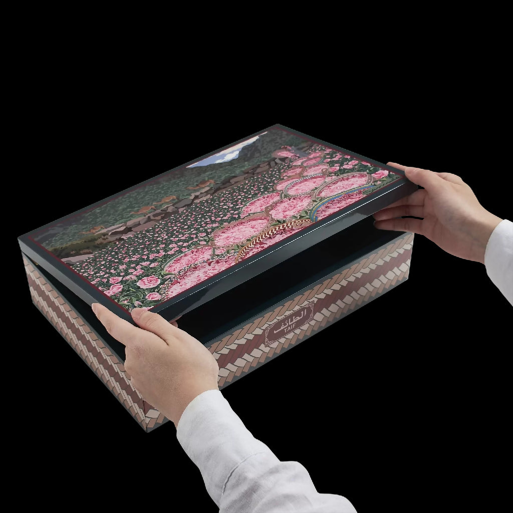Rich in detail and charm, the Taif Wooden Box in large size celebrates the breathtaking beauty of Saudi Arabia’s floral highlands. Finished with 12 layers of lacquer, this vivid and versatile box offers the perfect home for chocolates, dates, jewelry, accessories, or scarves. The artwork showcases vibrant flowers placed in traditional woven baskets, with intricate borders echoing the region’s signature weaving techniques.