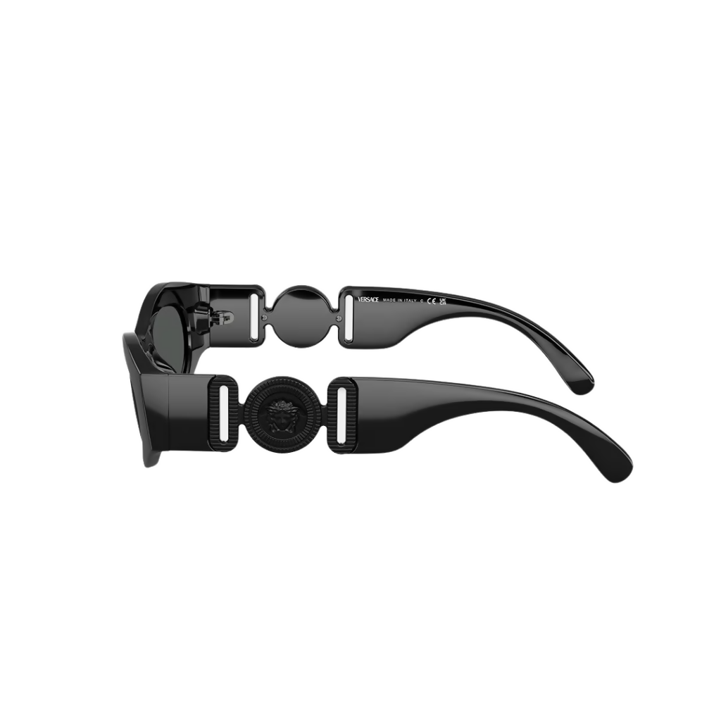 A bold expression of elegance, these women’s sunglasses from Versace feature a sculpted black oval frame adorned with the iconic Medusa medallion on the temples. The deep grey lenses offer a sleek, modern aesthetic while providing essential sun protection. This design combines high fashion and timeless Italian craftsmanship.